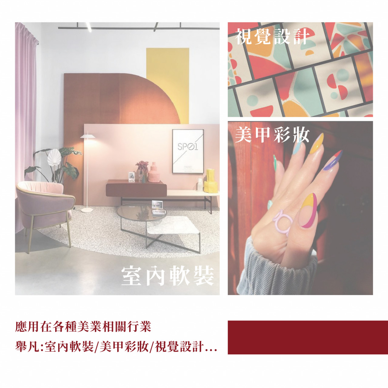 在 JPCA 基因色彩課程中學習到的色彩理論與配色可以連結的產業很多:時尚時裝、彩妝、美髮、美甲、新娘造型、彩繪、平面設計的色彩配色、室內裝潢設計的色彩配色...等